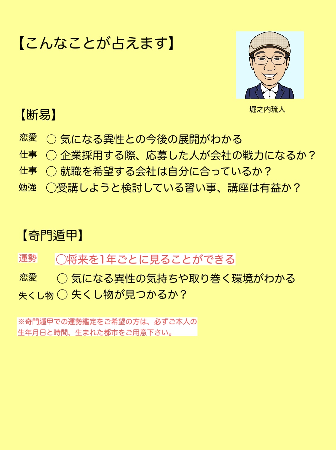 また『堀之内チャンネル』というYouTubeをしています。どんなことが占えるのかを皆様に知って頂けるように、断易や奇門遁甲による鑑定動画をあげています。ご覧下さると嬉しいです。