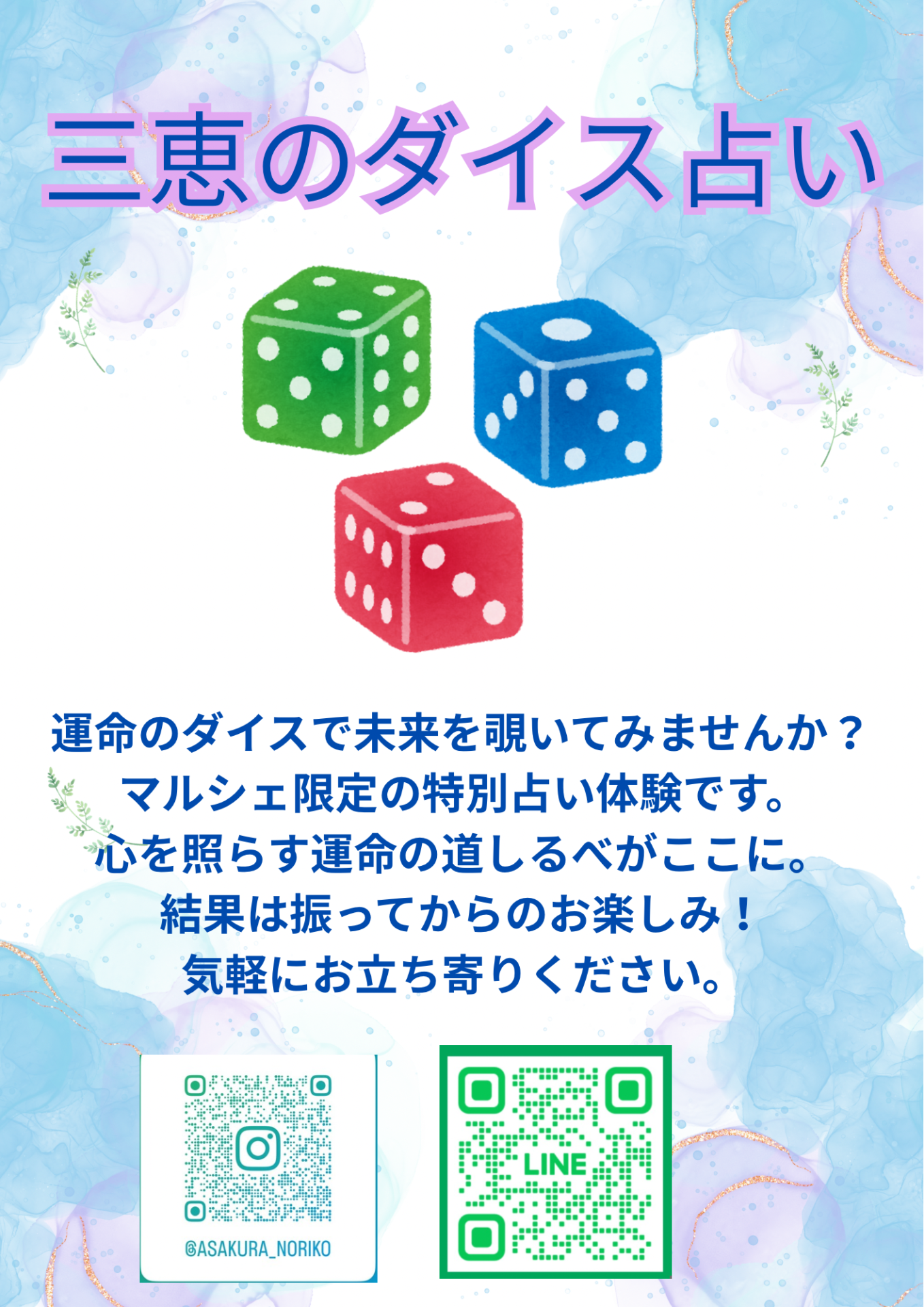 出展情報 出展名 三恵さんの人相占い 出展エリア コンベンションホール ジャンル 人相占い、ダイス占い 各種SNS メニュー 人相占い、ダイス占い メッセージ 人相占いは顔の特徴を見て性格や運命を 知る方法です。額、眉、目、鼻、口がポイントで、これを元に未来を予測します。 最後にダイス占いをします。
